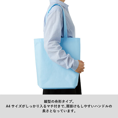 A4サイズがしっかりたっぷり入るマチ付きの舟形トートバッグです。軽量で丈夫な不織布素材もポイント。カラー展開は全11色と豊富ですので、名入れデザインに合わせてお選びください。