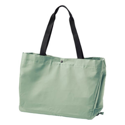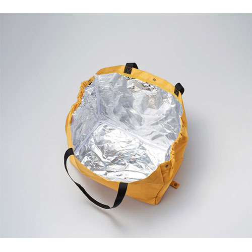 再生PET繊維を素材に用いたエコな保冷温ショッピングバッグ。バッグの口のゴムを、レジカゴにフィットさせて設置することができるので、袋詰め作業が簡単!小さく畳めて持ち運びに便利です。